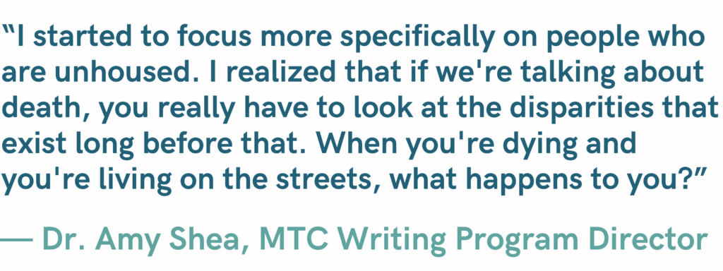 As she moved through her research, Amy’s focus shifted towards broader issues of inequality. “I started to focus more specifically on people who are unhoused. I realized that if we’re talking about death, you really have to look at the disparities that exist long before that. When you’re dying and you’re living on the streets, what happens to you?”